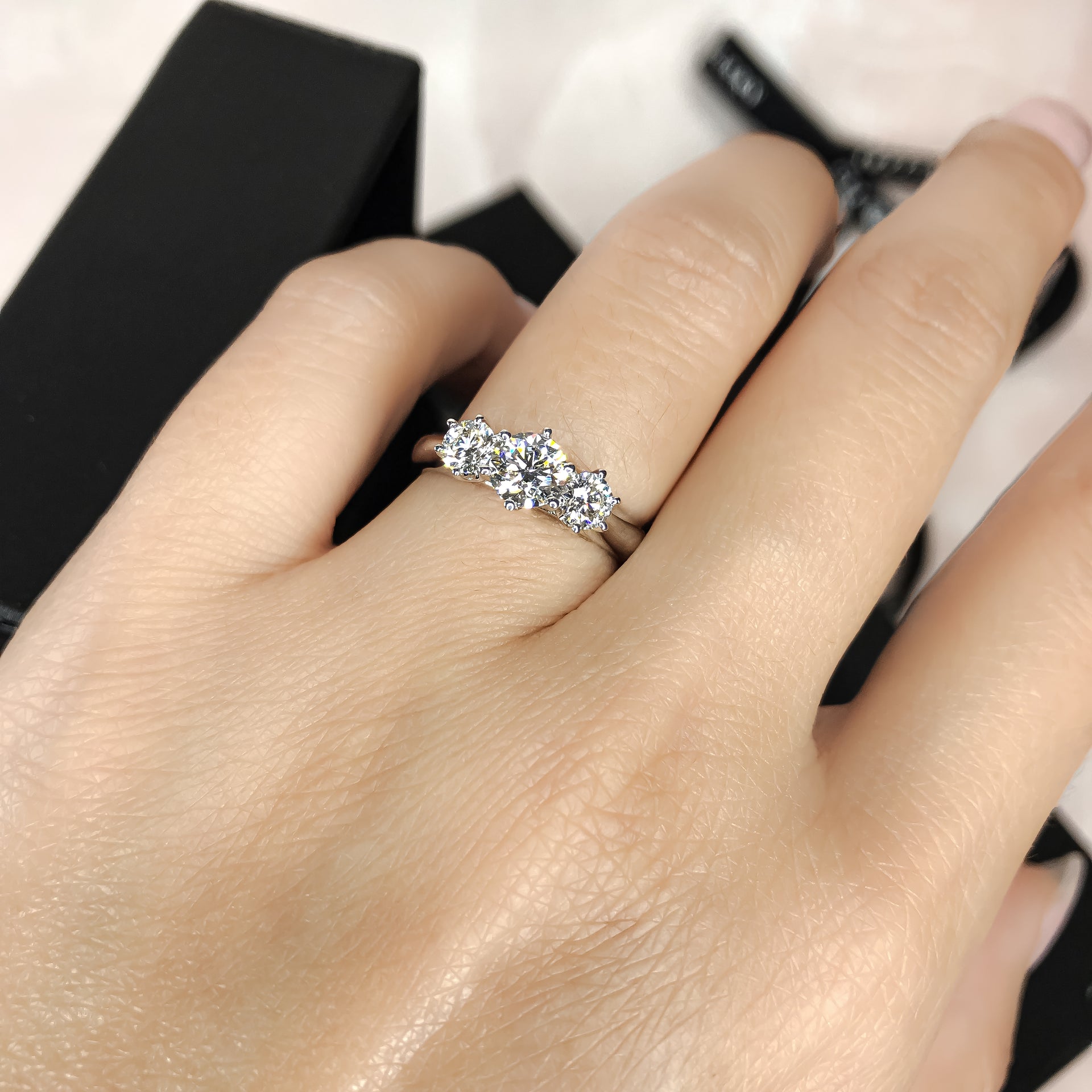 Three-stone rings, also called trilogy rings, are a classic design featuring three main diamonds set into the centre of the ring, with the centre diamond usually being larger than the two side stones. The three-stone design creates a stunning, bright look owing to the extra design elements.