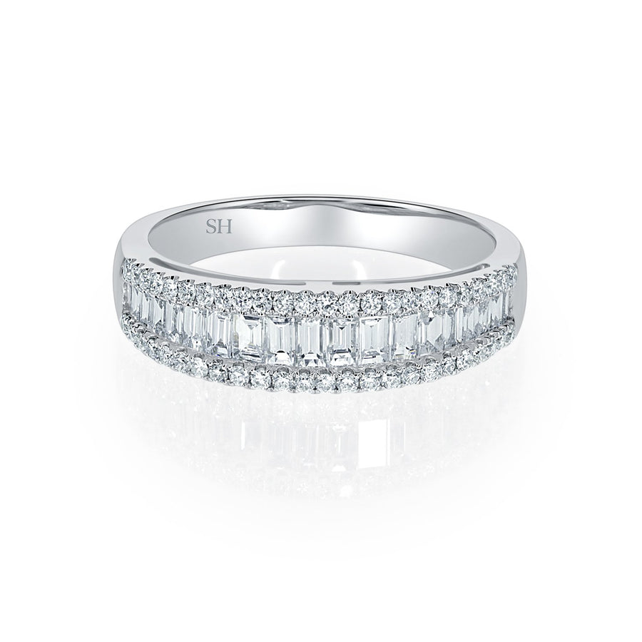 A pathway of tapered baguette diamonds set between a trim of pave set round diamonds. A slim width and adoring brightness.