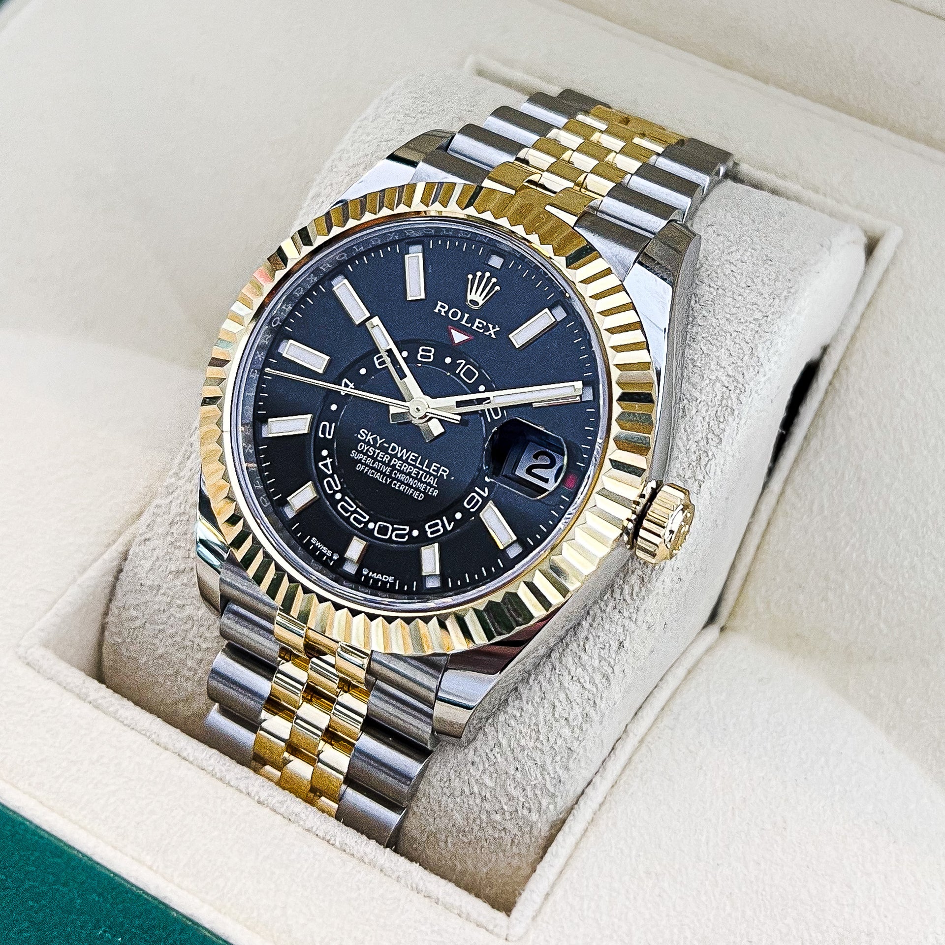 The Rolex Sky-Dweller is available in a variety of premium materials, including Oystersteel, yellow gold, white gold, Everose gold, and Rolesor (a combination of Oystersteel and gold). Each version features a scratch-resistant sapphire crystal and a highly durable Oyster case, ensuring longevity and luxury in every design.