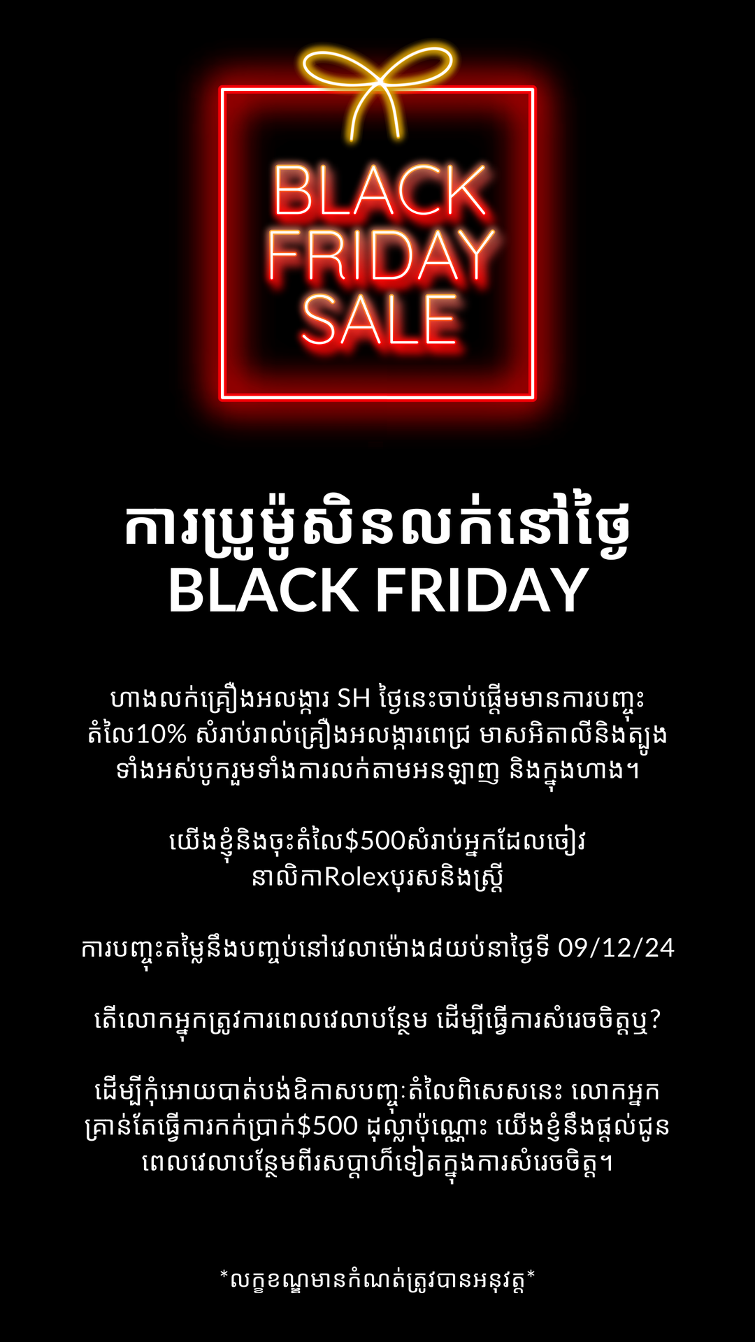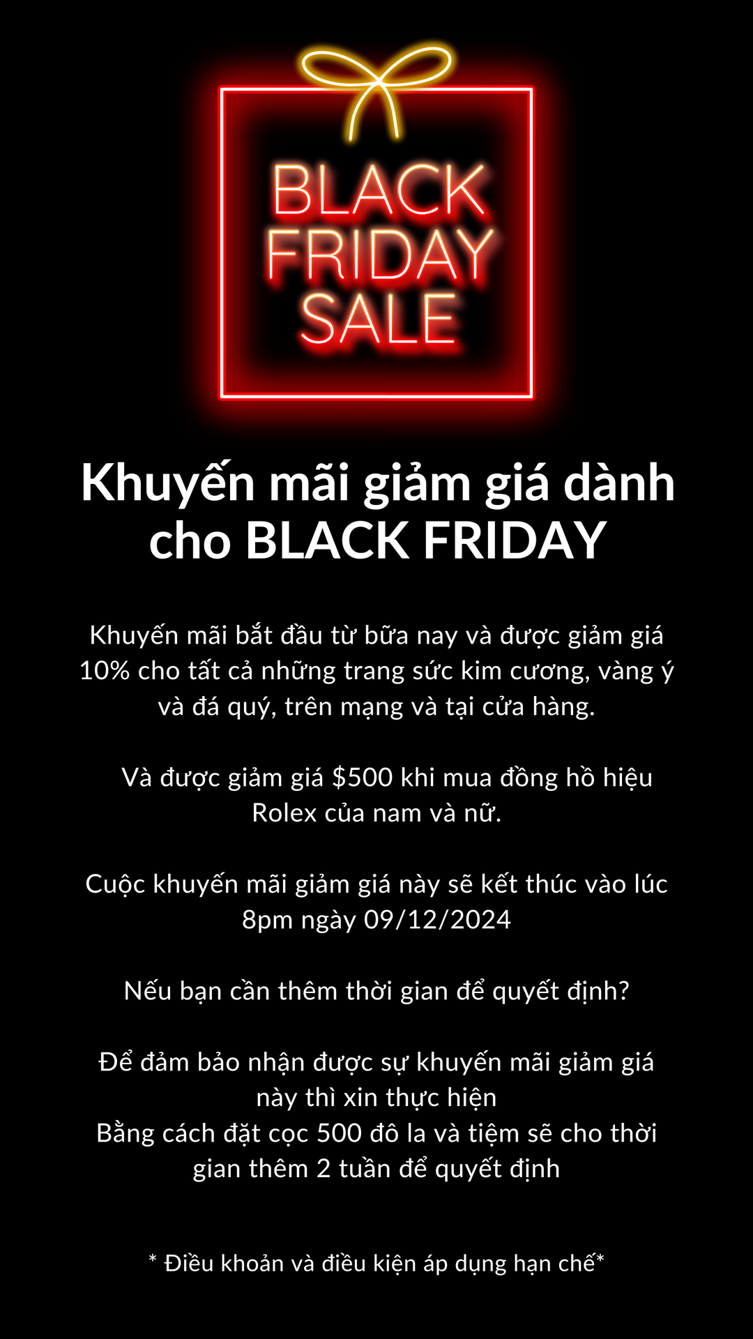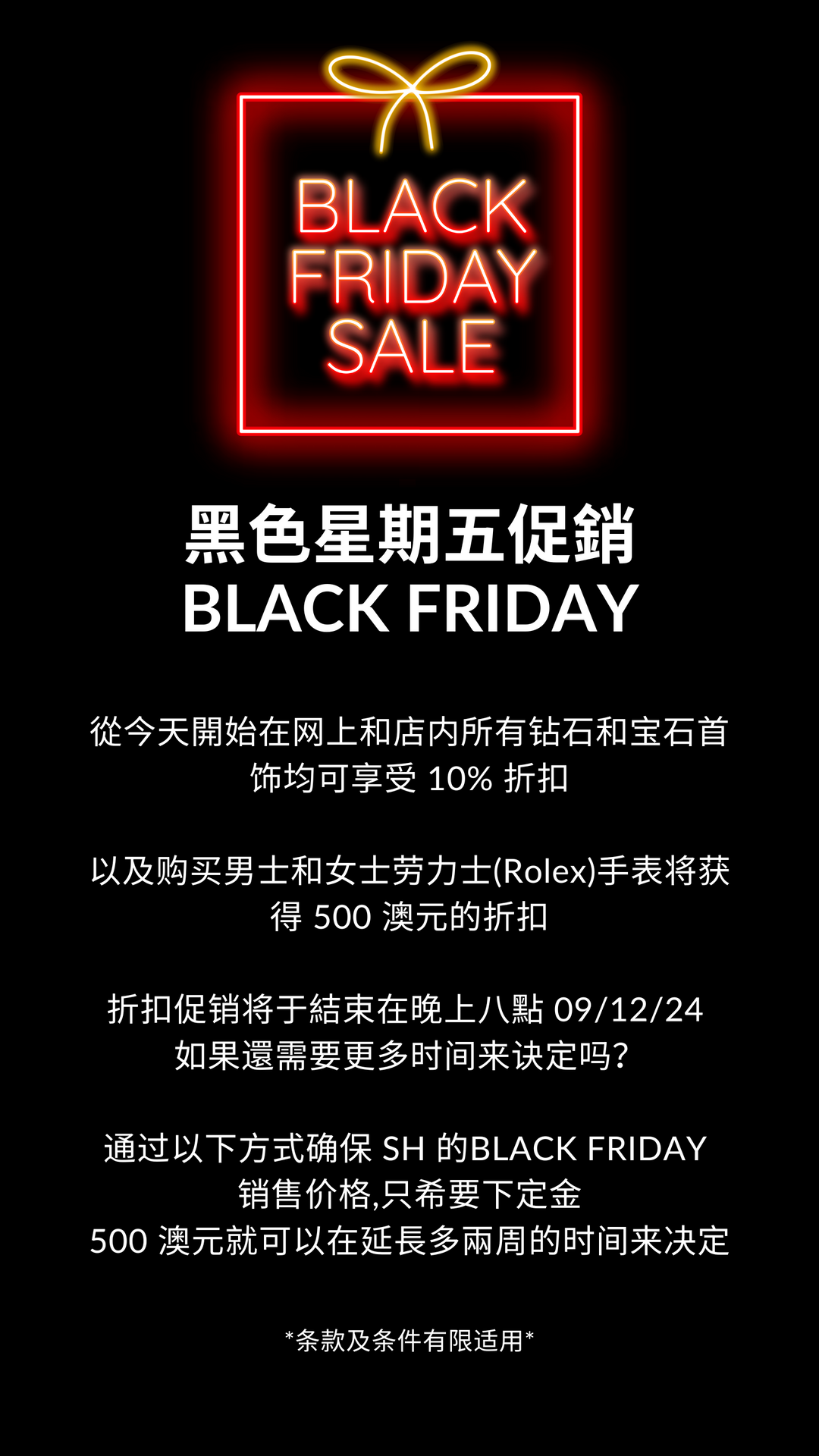 The 10% OFF Black Friday sale at SH is applicable to all diamond, gold and gemstone jewellery currently in stock online & instore. The Black Friday jewellery deals exclude solid gold items, services & gift cards. We’re also offering $500 OFF authentic Men’s and Women’s Rolex watches.