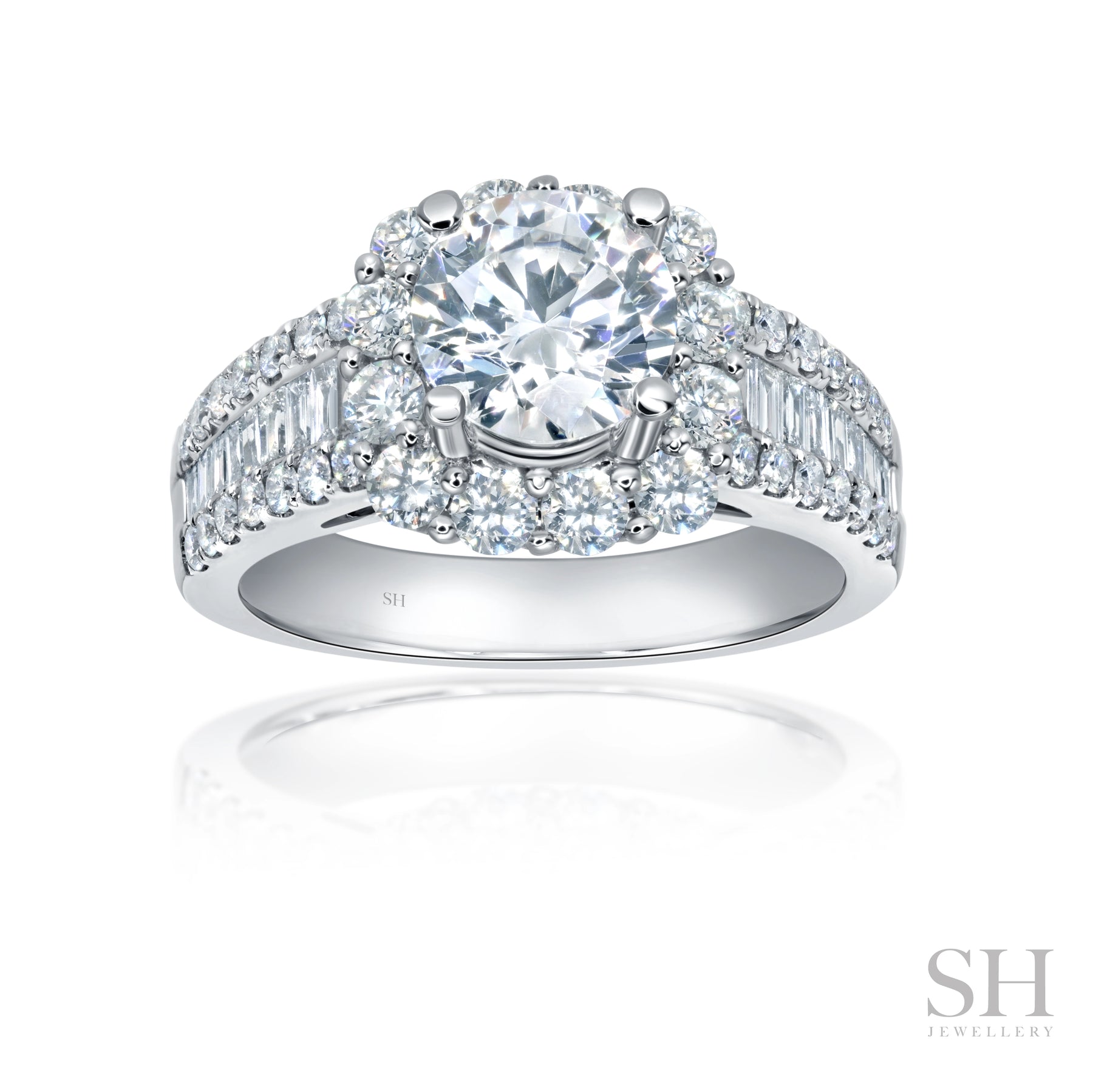 With its bold yet graceful design, this piece is designed to capture attention from every angle. The halo draws focus to the centre stone, while the baguette-set band brings subtle sparkle and structure. A polished finish completes the look, making it timeless and contemporary.