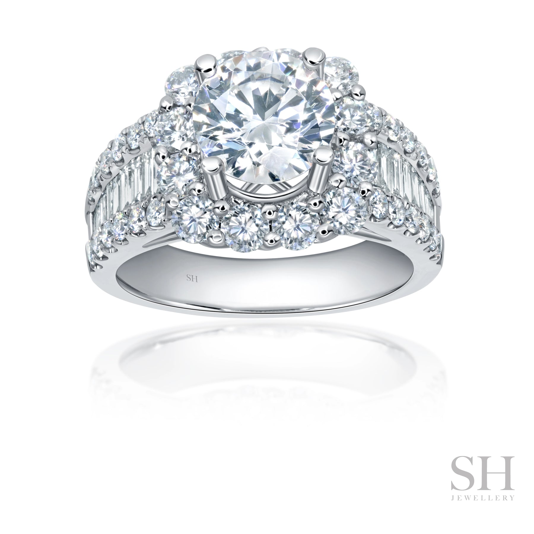 This ring makes a bold statement while keeping a timeless beauty. The cushion halo enhances the centre stone’s brilliance, while the wider band with baguette accents adds strength and sophistication. A polished white gold finish completes its design.