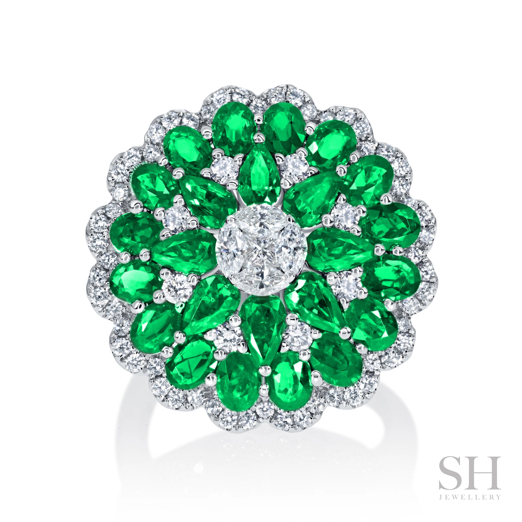 A masterpiece that combines sophistication with striking visual impact. This luxurious ring features 24 natural emeralds totalling 4.5 carats, expertly arranged in a captivating hemisphere design that catches light from every angle. Whether you're looking for a statement piece that commands attention or a timeless investment in fine jewellery, this ring delivers both beauty and wearability in one exquisite package.